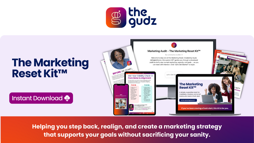The Marketing Reset Kit™ helps you pause, get clear, and rebuild a marketing approach that fits your real life, not someone else’s algorithm, schedule, or energy.