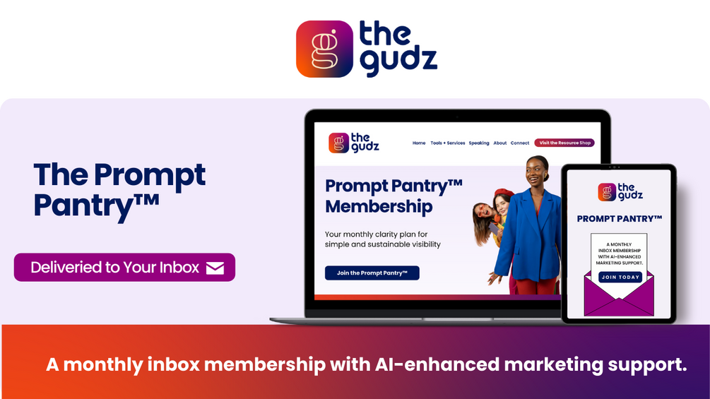 I’m Alysia Gradney, certificed marketing strategist and coach behind The Gudz, and I created Prompt Pantry for people who want clarity, not chaos. The tools and resources that I create respect your mental wellness and capacity, not compete with it.